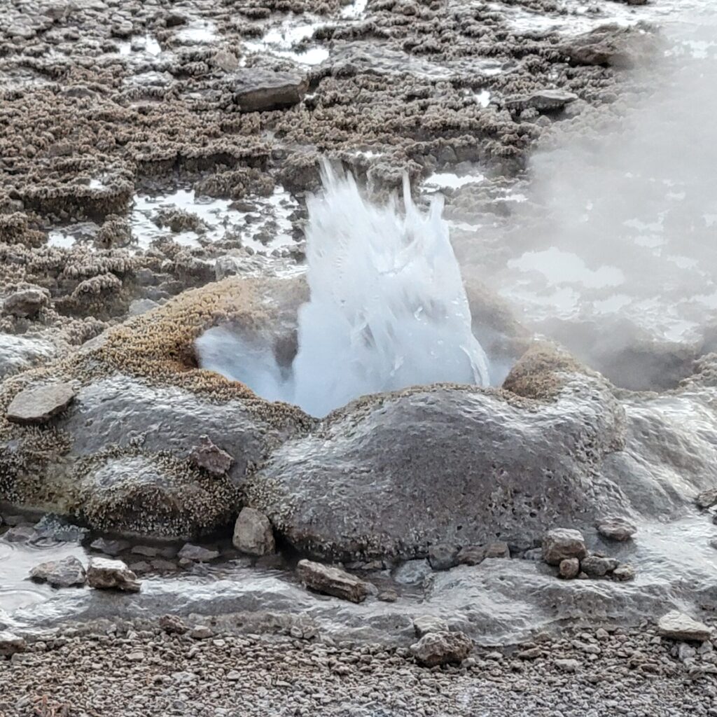 Am nächsten morgen geht´s bereits um 05:30 los. Wir wollen zu den Geysiren von Tatio. Da man diese am besten kurz vor Sonnenaufgang sehen kann müssen wir früh los, denn die Fahrt dauert etwa 1,5 Stunden. Die Tatio Geysire sind nicht besonders groß, aber sehr viele. Auf dem Tatio Geysirfeld gibt es über 100 Punkte an denen das heiße Wasser austritt. Speziell am frühen morgen sind die Dampffontänen am besten zu beobachten, da die Umgebungstemperatur bei etwa – 5 Grad liegt. Wenn es dann nach Sonnenaufgang sehr rasch wärmer wird ist der austretende Dampf kaum mehr zu sehen. Die Fahrt hier her lohnt sich auf jeden Fall. Man sollte sich allerdings darauf einstellen, das nicht allein ist. Jeden morgen rollt eine Kolonne aus über hundert Mercedes Sprintern von San Pedro in Richtung Tatio. Also eher sowas wie ein Massenhappening. Auf dem Rückweg halten wir noch in dem kleinen Dorf Machuca. Dort gibt es die angeblich älteste Kirche in Chile (soll aus dem 16 Jahrhundert sein) und Lama Spieße die Claudia auch gleich mal probieren muss.